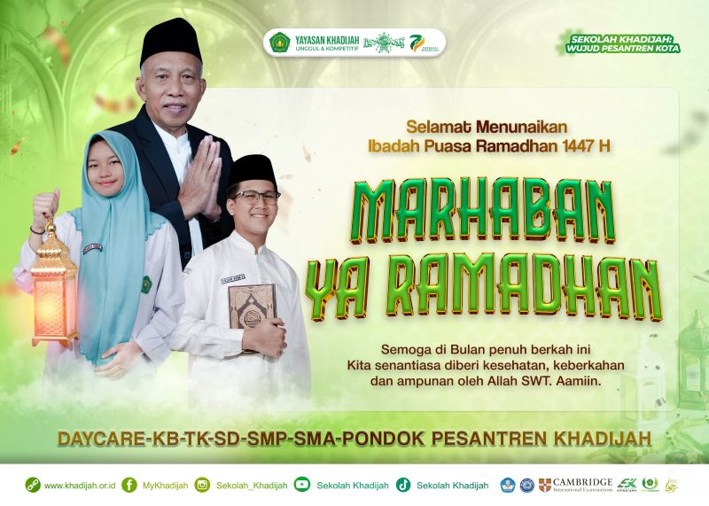 Selamat datang bulan suci Ramadhan tahun 1447 H. Penetapan awal bulan Ramadhan tahun ini oleh Pemerintah Republik Indonesia melalui Kementerian Agama RI jatuh pada tanggal 19 Februari 2026. Mari menyambut datangnya bulan suci dengan sepenuh hati dan senang hati. Demikian pesan Ketua I Yayasan Khadijah Drs.H.Abdullah Sani, M.Pd. Kemudian dengan cara apa kita menyambut tamu istimewa dari Allah SWT. Yaitu dengan cara meningkatkan taqwa kita dengan menjalan ibadah puasa dengan maksimal, melaksanakan qiyamul lail, memperbanyak sedekah dan tadarus Al Quran. Bulan Ramadhan adalah bulan turunnya mukjizal terbesar Rasulullah Muhammad SAW yakni Al Quran.