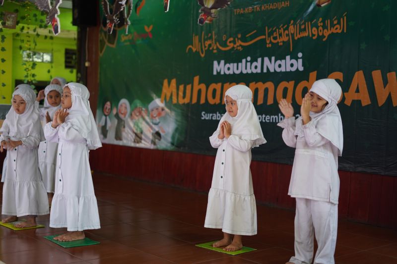 Seluruh murid KB-TK Khadijah berkumpul bersama dengan para ibu guru membaca sholawat kepada junjungan tercinta Rasul Muhammad SAW. ( 12/9/2025). Kegiatan yang diawali dengan membaca surat Al Fatihah secara bersama-sama. dilanjutkan membaca asmaul husna yang dipimpin oleh Bu Zila dan Bu Widi. Sebelum pembacaan Maulid Dibai. Kepala PAUD Khadijah Bu Siti Malichah, S.Pd menyampaikan bahwa kegiatan peringatan Maulid Nabi Muhammad SAW di sekolah bertujuan untuk menanamkan kecintaan kepada Nabi Besar Muhammad SAW sang teladan terbaik untuk umatnya.